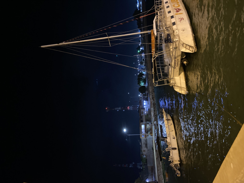 Two docked boats are captured at night. The larger sailboat features a tall mast, white hull, and "CLUB CJB" markings. Smaller boat sits behind the bigger. Night sky is clear and dark. Lights from the buildings and streetlight illuminate the area. A tall communication tower stands further back on the left. The water reflects the ambient light.