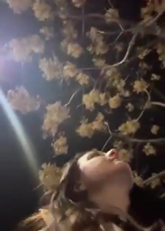 A low-angle shot shows a woman looking up at branches with yellow flowers, likely at night