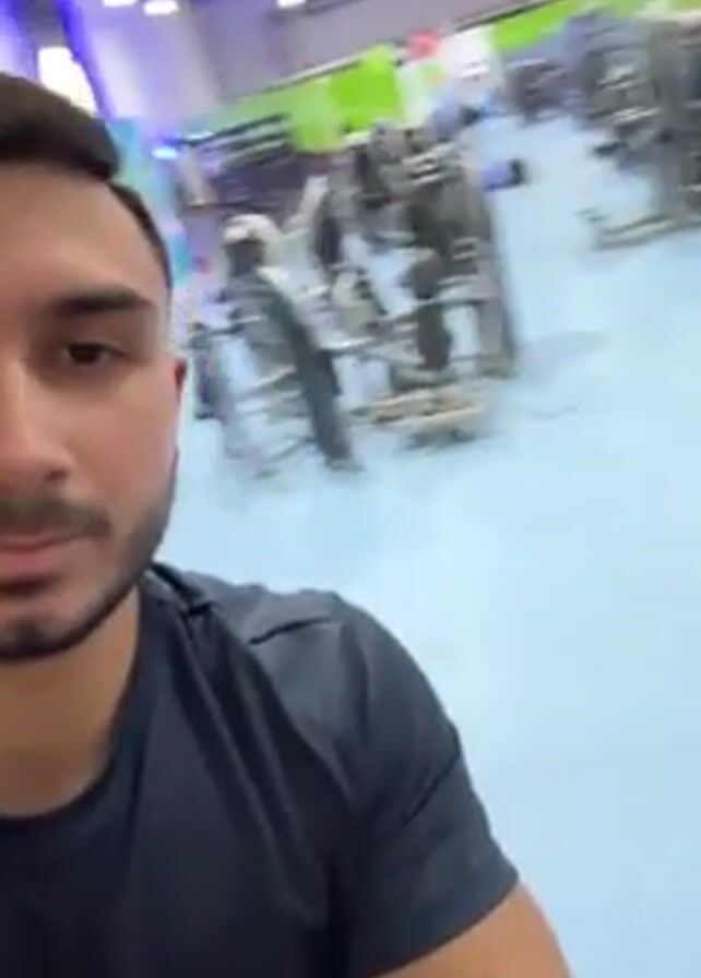 A man with short brown hair and a trimmed beard is holding a phone, taking a selfie video in what appears to be a gym. He's wearing a dark short-sleeved shirt. In the background, various weightlifting machines are visible on a light blue floor. There are other people in the gym, some using the equipment. The gym has high ceilings and bright lighting with blue and green accents on the walls and fixtures. The man is looking at the camera.