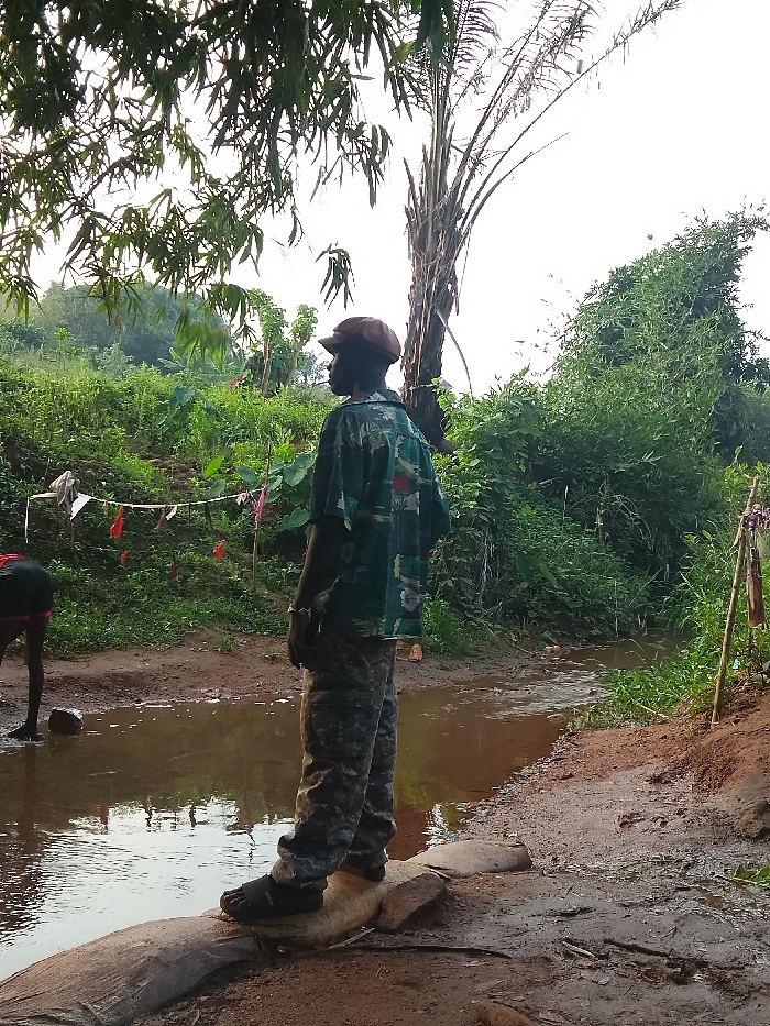 A man with a hat stands on a log over a muddy stream. He faces left, wearing a patterned shirt and camouflage pants. The stream runs through a lush, green landscape with dense vegetation on either side. There's a person with bare legs wading in the water to the left. In the background, colorful flags are strung up between plants. A tall, thin tree and overhanging branches frame the scene.