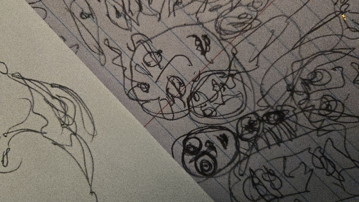 This image depicts a close-up, angled view of two distinct paper surfaces joined diagonally. The upper-left portion shows a section of plain, light gray paper with faint, abstract graphite or ink line art resembling an organic, possibly winged, shape. The dominant lower-right section features standard lined notebook paper, distinguishable by blue horizontal rules and a red vertical margin line. This lined paper is heavily covered with dense, overlapping, freehand sketches executed in dark graphite or black ink. The sketches primarily comprise highly stylized, caricatured faces or heads with exaggerated features such as large, circular eyes and prominent mouths. Additional abstract lines and shapes are integrated within the composition. No individuals or three-dimensional objects are present. The scene is located in Lompoc, United States.