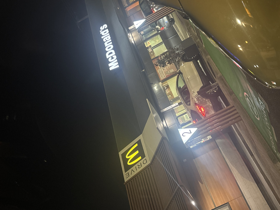 A sideways view captures a McDonald's drive-thru at night. The iconic golden arches "M" is vertically stacked above "DRIVE". The "McDonald's" logo is illuminated on the side of the building. A white car is positioned at window number 2. The scene is dark with bright lights highlighting the drive-thru. A portion of the vehicle taking the photo is visible in the upper right corner.