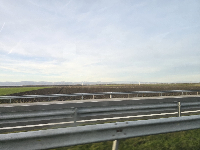 This image captures a rural landscape near Загорци, Bulgaria, observed from a low vantage point, possibly from a vehicle