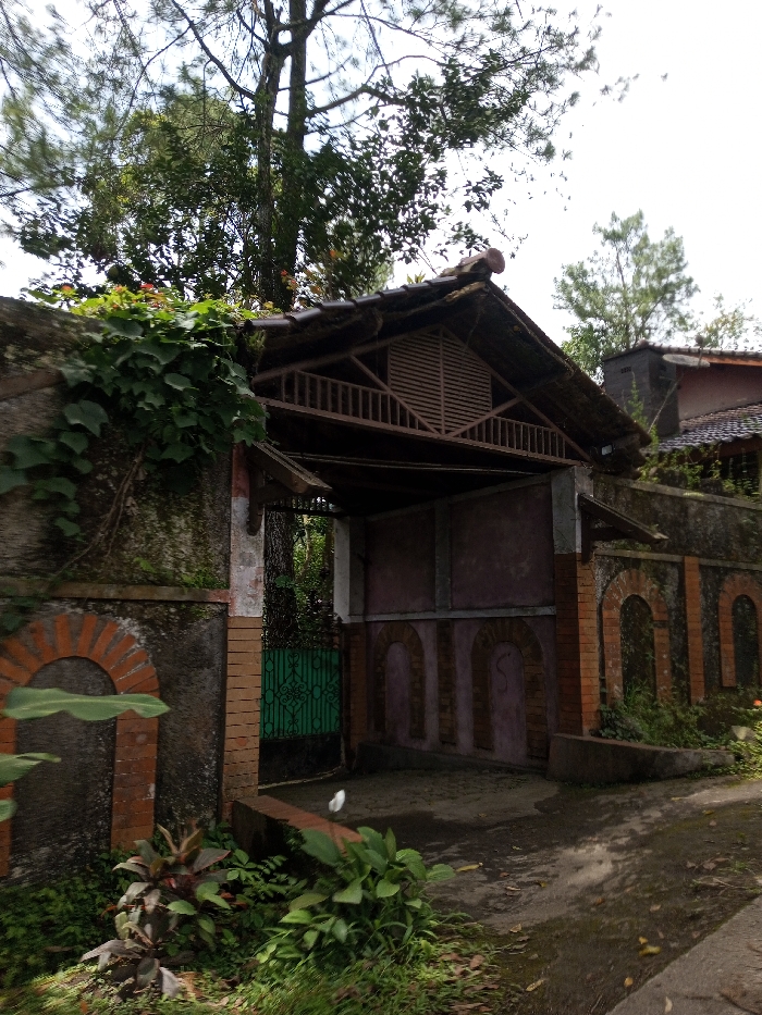 The image depicts an outdoor scene in Ariyalai, Sri Lanka, showing the entrance to a property from a low-angle perspective. The central feature is a covered gateway with a dark, peaked roof exhibiting some moss and an ornamental finial at its apex. Beneath the roof, a slatted wooden gable and a horizontal railing are visible. The entrance itself is framed by rough concrete walls. The wall on the left is heavily covered in green ivy or a similar climbing plant and features a recessed archway detail constructed from reddish bricks at its base. The right side of the gateway structure has walls painted a muted purplish-brown, displaying multiple vertical recessed archway details, some appearing in brick. A dark green metal gate with an intricate geometric pattern is recessed within the gateway's opening. The ground leading to the gate is a dirt or unpaved path, wet in various spots, with patches of green grass and diverse low-lying vegetation. This includes plants with broad green leaves and others with reddish-brown foliage, alongside a distinct small white flower near the center-foreground. Tall, slender trees with sparse canopies, possibly pine or similar conifers, dominate the upper background against a bright, overcast sky. To the far right, beyond the main gate structure, an additional section of wall with brick archway details and part of another building with a dark roof and a dark chimney-like structure are visible. No individuals or animals are present, and no actions or interactions are depicted.