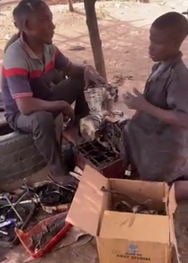 two individuals in an outdoor setting. One is an adult male sitting on a stack of tires, wearing a striped shirt and dark pants. He is looking towards a young boy who is kneeling on the ground next to a cardboard box filled with parts. The box has "ROSY SPECIAL" printed on it. The boy is wearing a dark uniform-like outfit. They are both next to a motorcycle engine that is sitting on a metal grate. There are various tools and parts scattered around the ground, including a red mudguard. The background shows trees, buildings, and a sandy ground surface. The scene appears to be a makeshift repair shop of some kind.