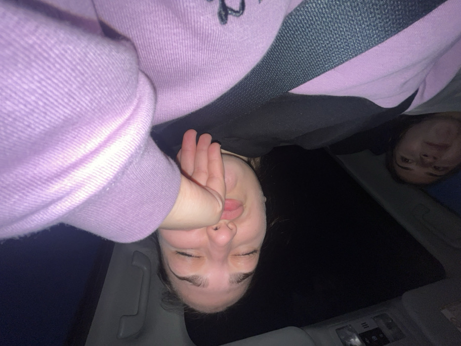 This image depicts the interior of a vehicle at night in Vendenheim, France, featuring two individuals. In the foreground, positioned upside down due to the camera's orientation, is a person wearing a light purple hooded sweatshirt and a dark garment beneath, secured by a dark gray seatbelt. This individual's left hand is partially covering their mouth and nose, while their tongue protrudes slightly. Their eyes are closed or heavily squinted. The upper left portion of the image shows the vehicle's gray headliner, a grab handle, and an overhead console with illuminated controls. In the background, towards the lower center-right, a second individual's head and upper torso are visible, appearing to recline on a blue cushion or fabric. This person is looking upwards towards the camera with a neutral expression. The external environment visible through the vehicle's windows is uniformly dark, indicating nighttime conditions.