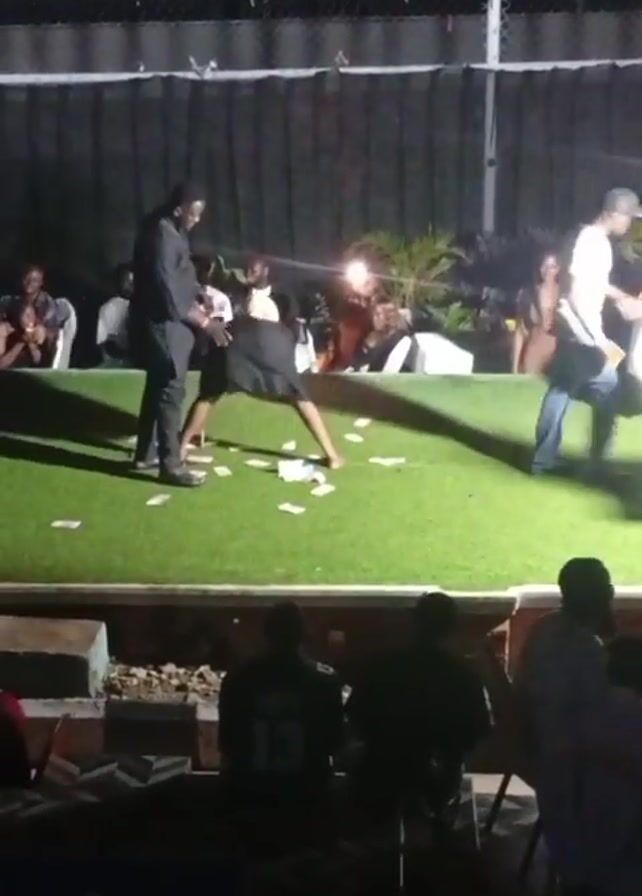 The scene depicts a performance of some kind taking place outdoors at night. A man in a dark suit is standing on what appears to be a small stage covered in artificial grass. In front of him, a person in a dark dress is crouched low with legs spread apart. Several bank notes are scattered on the ground around them. The audience is seated on chairs in front of the stage. The scene is illuminated by stage lights and the light from cell phone cameras held by members of the audience. A chain-link fence is visible in the background.