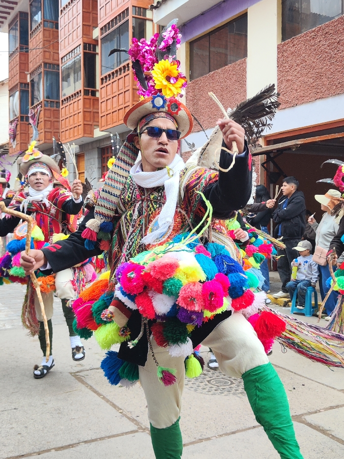 A vibrant cultural celebration unfolds on a city street. A man in sunglasses leads the procession, adorned in a colorful, heavily decorated costume with pom-poms, a patterned robe, and a feathered headdress. Another person in a similar, less flamboyant costume follows behind. Spectators are visible along the street, adding to the festive atmosphere. Buildings with balconies serve as a backdrop.
