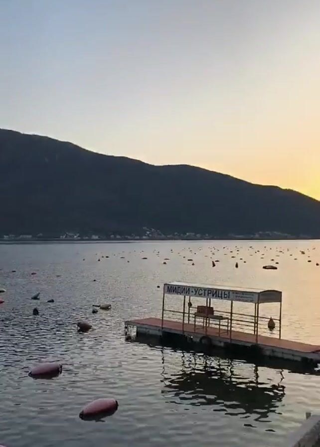 tranquil seascape at dawn or dusk, with mountains in the background and a calm body of water in the foreground. Numerous red buoys dot the water's surface, indicating oyster or mussel farming. A small floating dock with a shelter structure stands in the middle of the frame, bearing a sign in Russian "МИДИИ - УСТРИЦЫ" which translates to "Mussels - Oysters". The light from the sun reflecting on the water gives it a golden shimmer. The horizon is marked by a gradient of color, transitioning from dark to lighter shades of orange, merging with a pale blue sky.