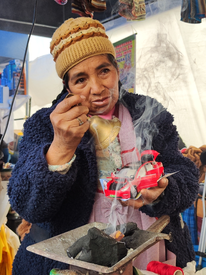 An indigenous woman wearing a tan knit hat and navy sweater holds a gold bell in her left hand while performing a ritual over burning charcoal. She holds a paper cutout of a red sports car in her right hand, and smoke swirls around it. She wears a red and white checkered apron. The backdrop includes various items for sale and a sign with green and yellow text.