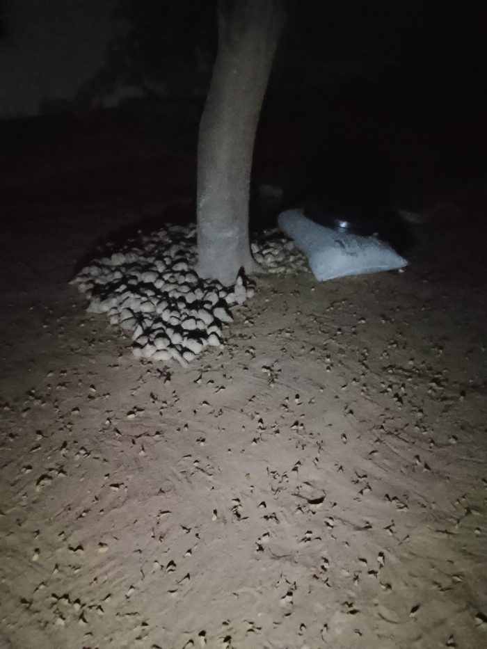 A dimly lit, ground-level view reveals a tree trunk surrounded by a cluster of small, light-colored rocks
