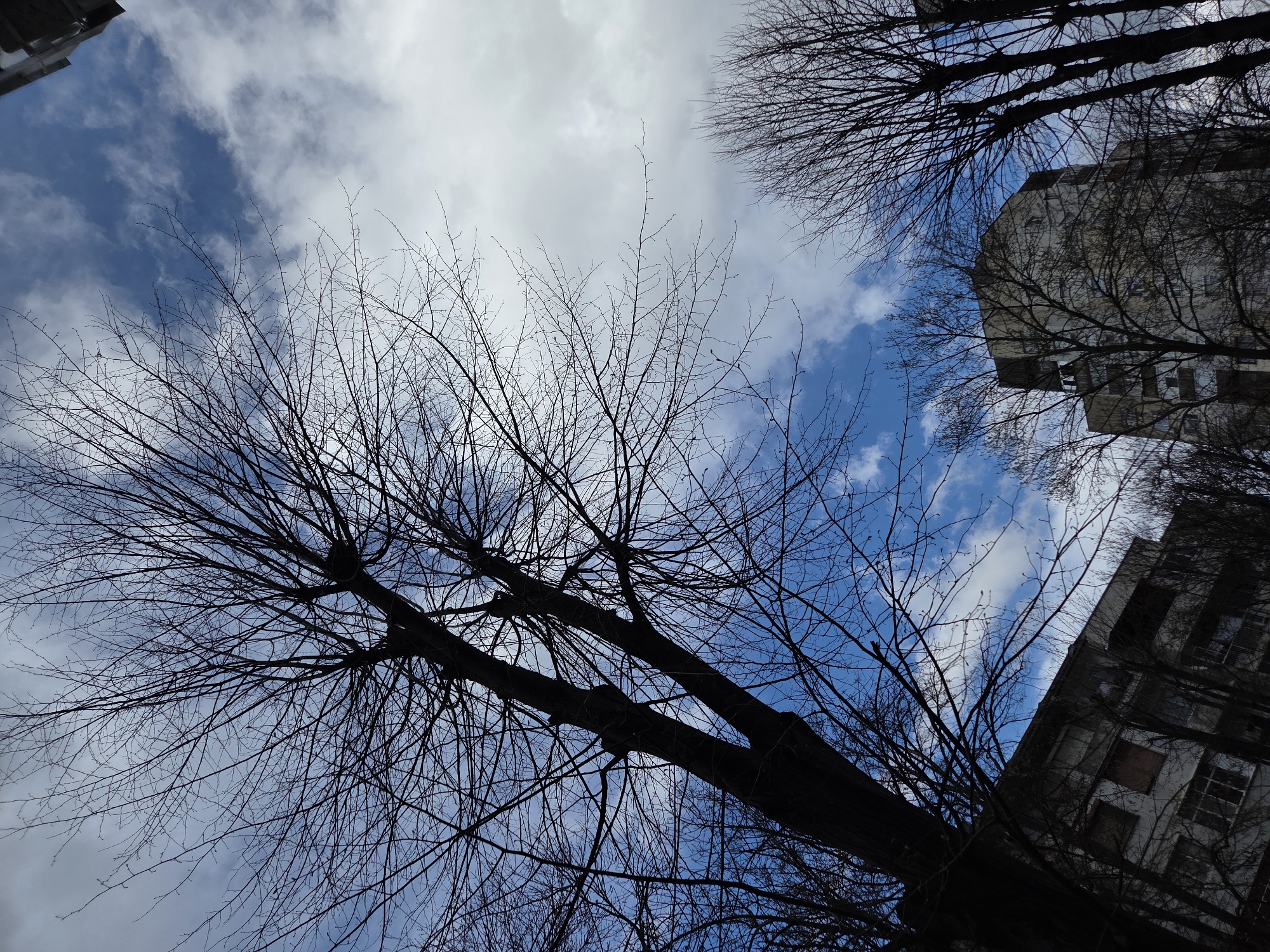 The image presents an urban scene in Pleven, Bulgaria, captured from a low-angle perspective looking upwards. The dominant features are multiple deciduous trees, bare of leaves, creating dark silhouettes against a partially blue and cloudy sky. A prominent tree in the left-center exhibits a thick trunk that divides into two main upward-extending limbs, from which numerous fine, dark branches spread across the frame. The sky displays patches of clear blue interspersed with white and light grey stratocumulus clouds. In the background, partially obscured by the trees, are two multi-story residential buildings. A light-colored building on the left shows multiple windows, some appearing dark or boarded. To the right, a taller, light-colored apartment block is visible, featuring balconies and windows. The leafless state of the trees indicates a non-foliage season. No individuals or active subjects are depicted.