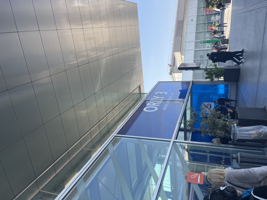 The scene is an exterior shot of the entrance to Orly Airport terminal 3 in Orly, France