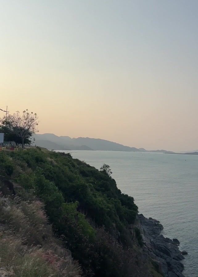 cliffside view of the ocean at dusk. The cliff is covered in green vegetation and rocky terrain. The ocean extends to the horizon, where distant mountains are visible. The sky is a light pastel color, suggesting either sunrise or sunset. There is a single tree near the top of the cliff.