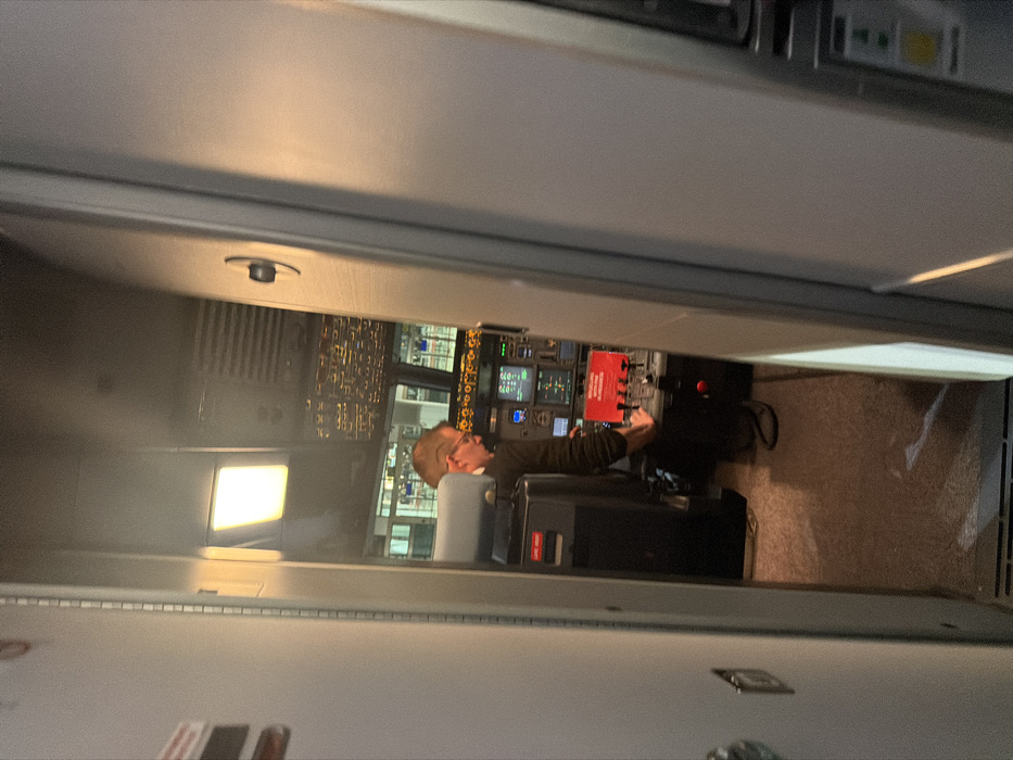 A pilot sits in the cockpit of an aircraft. The pilot is manipulating controls on the central panel. Numerous switches and gauges are visible on the panel behind him. The cockpit is brightly lit. The image is taken from behind the pilot, possibly from the passenger area, as the angle is looking into the cockpit space.