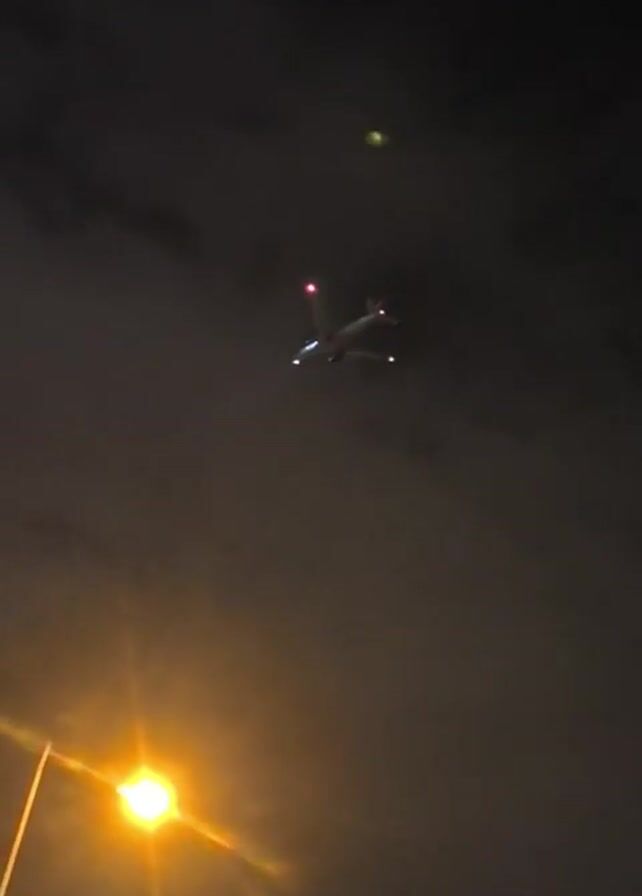 At night, an airplane descends in a cloudy sky. The aircraft is a light color and displays navigation lights. An orange street lamp with a long pole is located in the lower left corner of the frame. The sky is dark and filled with cloud cover. A faint, round light appears in the upper right corner of the frame.