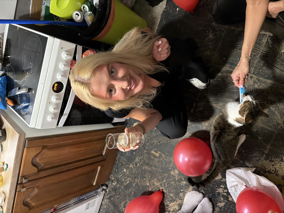A blonde woman kneels in a cluttered room, holding a glass of champagne. The room features a stove, wooden cabinets, and a green trash can. Red balloons are scattered on the floor. Another person is seen giving medication to a tabby cat. The floor appears dirty and the overall setting suggests a casual, possibly celebratory, atmosphere.