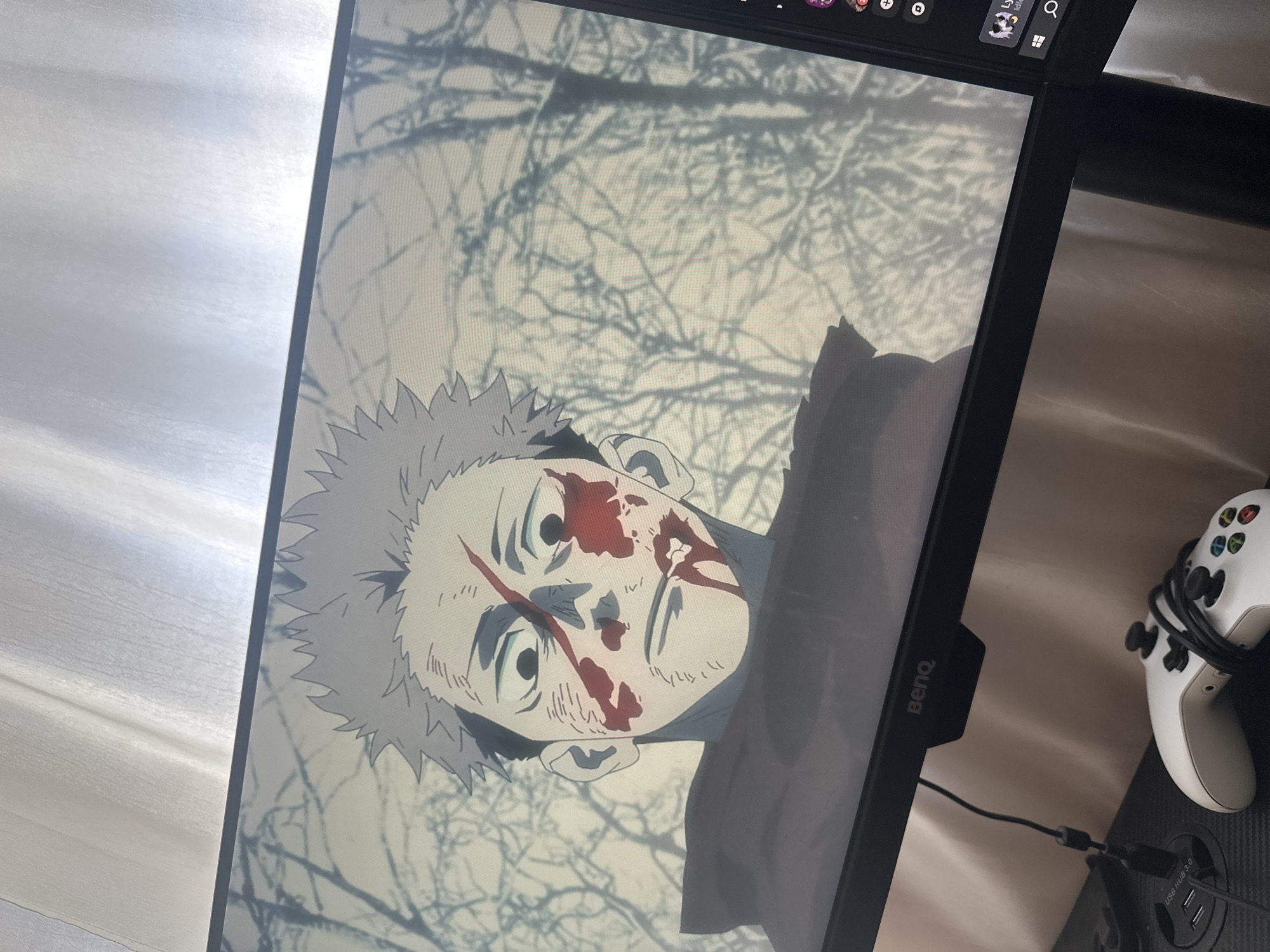 close-up of a computer monitor displaying an anime character with blood on their face, set against a background of bare tree branches. The monitor is a BenQ brand. A white Xbox controller is visible in the lower right corner of the frame, along with a USB hub. The image also includes a portion of a second monitor. The background setting appears to be indoors, with a curtain visible on the left side of the frame. The image appears to be taken from the perspective of someone looking at the monitor on a desk or table. There is no evidence that the scene is in Varna, Bulgaria.