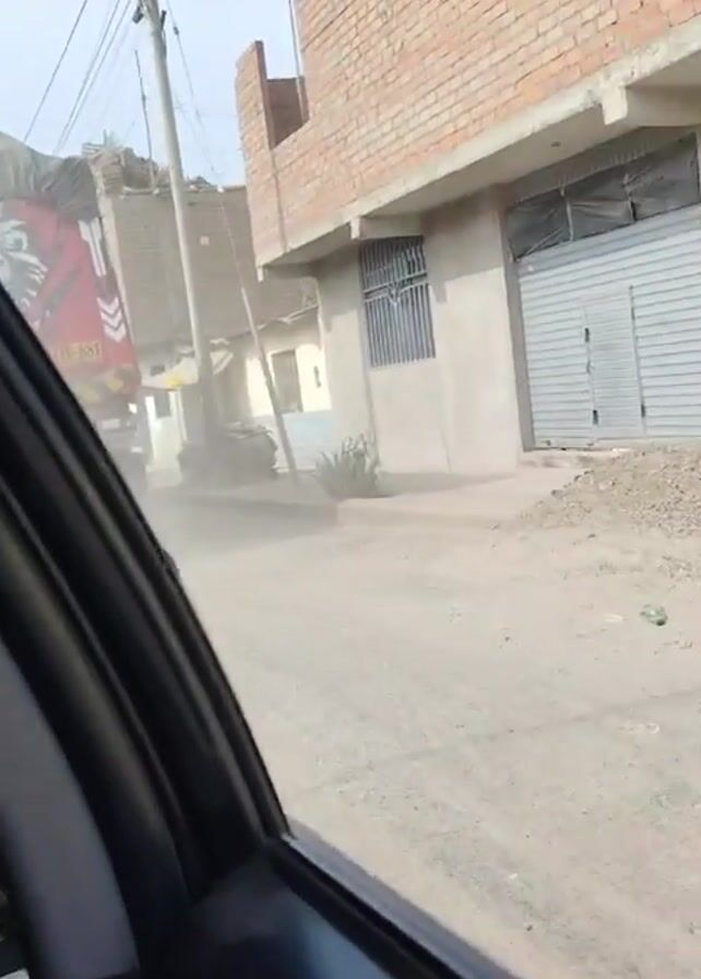 view from inside a car driving down a dusty road in a developing area. On the right, there's a two-story brick building under construction. A pile of gravel sits in front of it, and the windows have bars. A large truck drives by, creating a cloud of dust. Further down the road are smaller, older brick buildings, some with wooden supports and corrugated metal roofs. A motorcycle passes by as the car continues to move. The sky is bright, and power lines are visible overhead. The interior of the car is visible on the left, particularly the black door frame. The overall scene suggests a poor, arid environment.