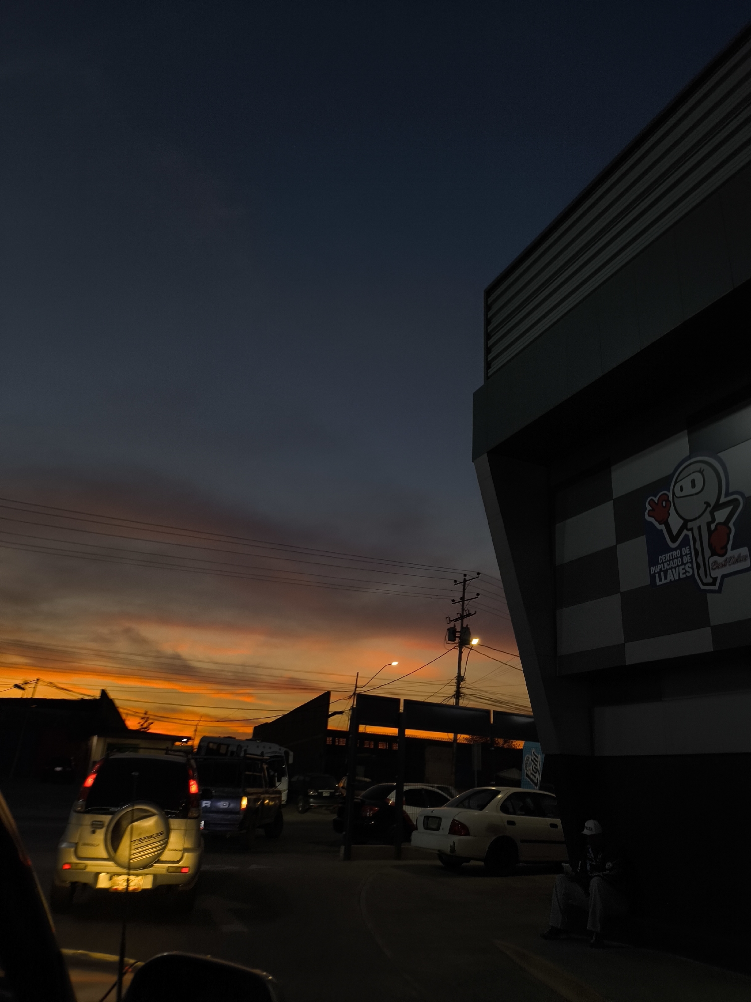 street scene in Las Barrancas, Venezuela at dusk. The sky displays a gradient from dark blue at the top to vibrant orange near the horizon. A commercial building dominates the right side of the frame, featuring a sign for "Centro de Duplicado de Llaves" (Key Duplication Center) with a cartoon key mascot. Cars are visible in the street, with their headlights and taillights illuminated. A person is sitting against the wall of the building in the lower right corner. Power lines and streetlights are visible in the background.