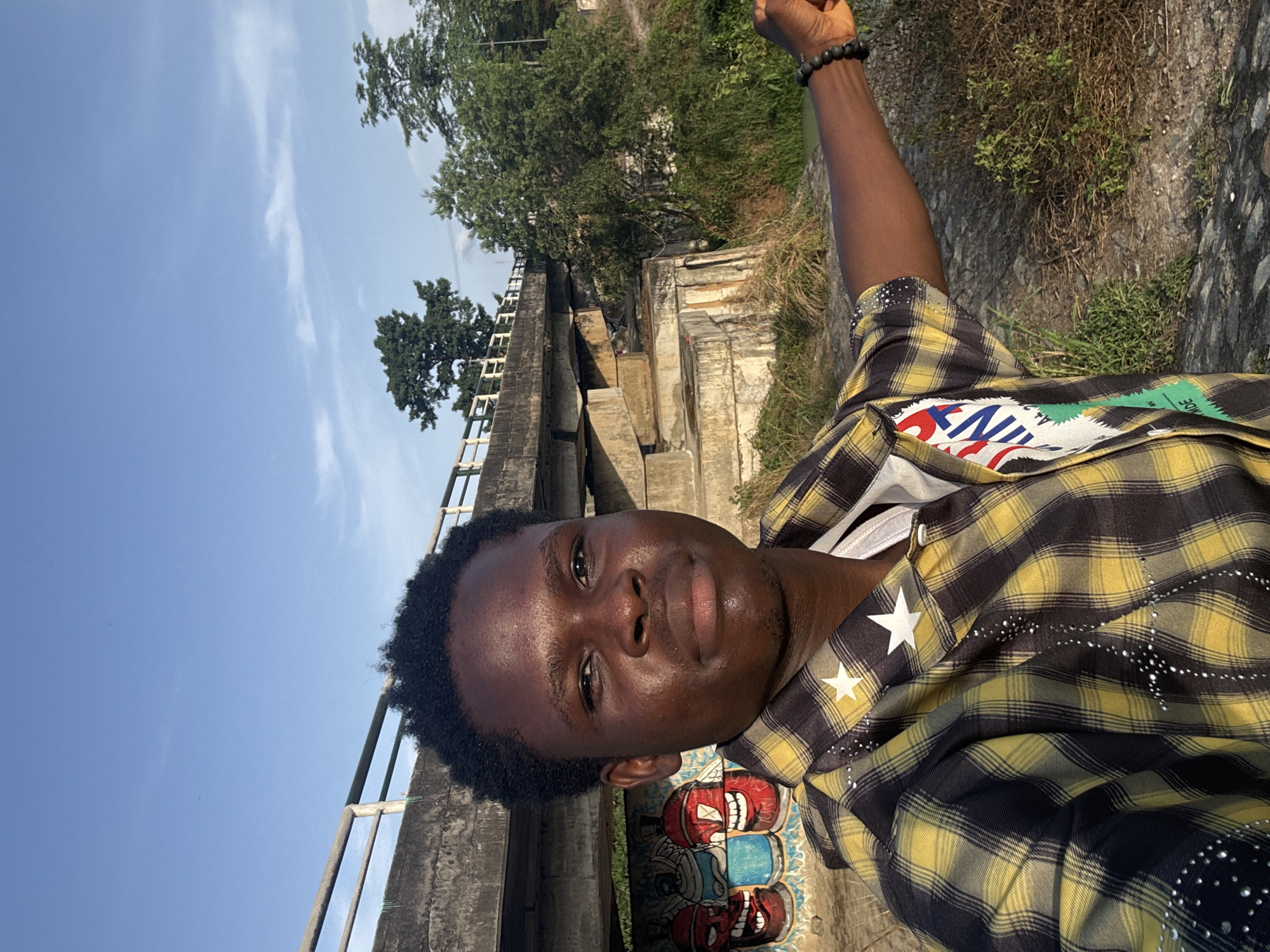 A selfie of a dark-skinned male with short black hair standing on a bridge, his right fist raised. He is wearing a yellow and black plaid shirt with white star embellishments and a white t-shirt underneath. Behind him is a concrete bridge railing with graffiti, and beyond that is greenery and trees. The sky is blue with some clouds. The location is Ihiagwa, Nigeria.