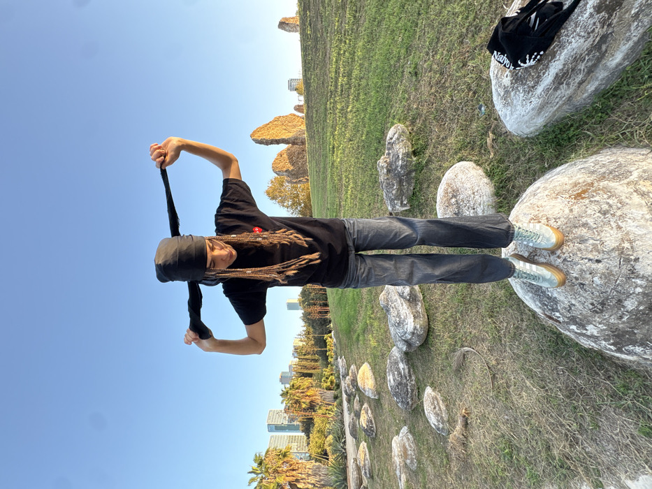 The image displays an outdoor scene in Ganei Yehoshua (Yarkon Park), Tel Aviv, Israel, under a clear blue sky. A young individual stands centrally on a large, rounded, light-colored rock. They are wearing a black short-sleeved t-shirt with a small red logo on the left chest, dark grey wide-leg jeans, and light blue/green platform sneakers. A black head covering is worn, and the individual holds two black fabric strips, possibly extensions of the head covering, with outstretched arms. Braided hair with beads is visible below the head covering, framing the face, which is directed downwards. The ground consists of green grass with numerous scattered, large, smooth, rounded light-colored rocks forming a path. A small lizard is present on the grass to the left of the rock path. To the right of the central subject, a crumpled black garment with white markings rests on another rock. In the distant background, a skyline of modern high-rise buildings is visible on the left, while several large, weathered, reddish-brown stone structures resembling ancient megaliths are prominent on the right. Palm trees and other vegetation are interspersed throughout the parkland, separating the immediate foreground from the city skyline.