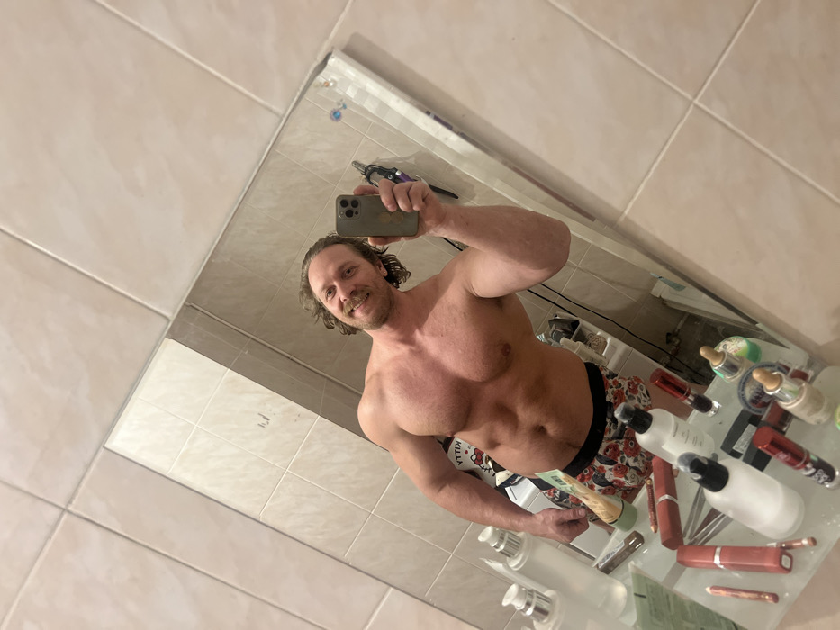 A muscular man with curly hair and a mustache takes a selfie in a bathroom mirror. He's shirtless, showcasing a defined physique. The bathroom features light-colored tiles and a cluttered countertop with various toiletries, including bottles and tubes. The mirror's reflection captures the man's focused expression and the scene's tilted perspective. The man is holding a smartphone.