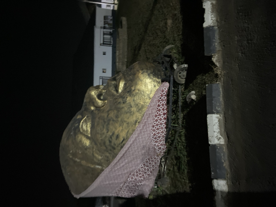 The image displays a large, golden-hued sculpture of a human head situated outdoors at night in Ife, Nigeria. The massive head, with a seemingly rough, textured surface, is positioned on its side atop a black metal trailer frame, which has visible wheels partially submerged in a grassy area. A light pink fabric, adorned with a geometric pattern of red and white circles, squares, and zigzag lines, is draped across the top and side of the head, partially obscuring its features. In the immediate foreground, a paved road surface is visible, bordered by a concrete curb painted in alternating black and white sections. The background reveals a building with white walls and a dark, sloped roof, illuminated by an artificial light source which creates distinct shadows across the scene. No individuals are present in the frame.