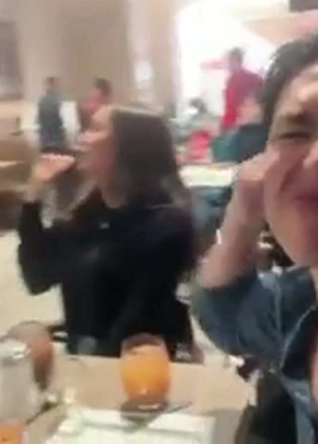 A young man is recording a video of himself at a restaurant, possibly at a celebration