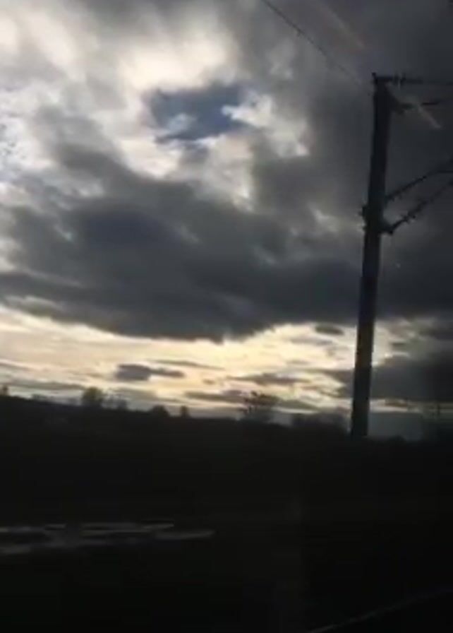 The video depicts a view from a moving train. The camera is pointed out the window. Outside, a field and trees are visible in silhouette against a cloudy sky. The sky is overcast with dark clouds, but there is a break in the clouds allowing some light to shine through. Overhead electrical wires and support poles are visible, passing quickly as the train moves. The overall tone is gloomy due to the dark clouds.