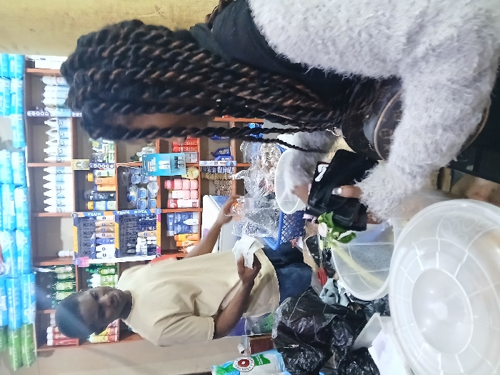The image depicts an interior view of a retail provision store in Jos, Nigeria. A young male, dressed in a beige t-shirt and blue jeans, stands behind a counter, holding white items in his left hand, looking towards a female customer. The female is viewed from her right profile, featuring long dark and brown twisted hair, wearing a light grey fuzzy long-sleeved top over a black garment. She holds a black wallet or small purse along with small green leafy produce in her hands. The background consists of multiple wooden shelves fully stocked with various packaged retail goods. These include personal care products, toiletries (shampoos, lotions, creams), and other household items, with brands like Nivea visible. Stacks of light blue and green packaged goods are visible on the topmost shelves. The counter area in the foreground is cluttered with several black plastic bags, a blue plastic basket containing goods, transparent plastic containers holding smaller items, and two large white plastic buckets, one with a translucent lid prominently featured in the lower left. A red-handled scissor is also visible on the counter. The scene indicates a commercial transaction occurring between the two individuals.