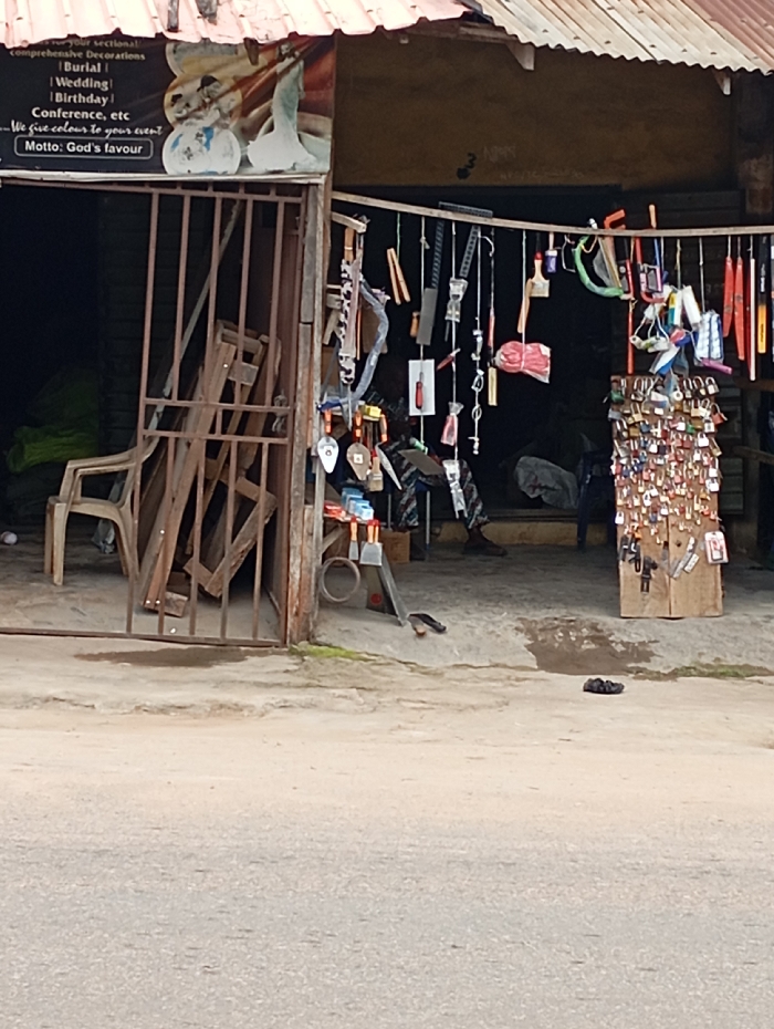 The image displays a street-level view of two adjacent, open-fronted commercial establishments under a corrugated metal roof. The left establishment features a dark interior accessed through a partially open brown metal gate, revealing a light-colored plastic chair and stacked wooden planks. Above this shop, a black sign with white text advertises "Comprehensive Decorations" for "Burial," "Wedding," "Birthday," and "Conference, etc.," with the motto "God's favour." The right establishment, under the same roof, serves as a hardware or tool shop, displaying numerous items including trowels, levels, brushes, and other hand tools suspended from a horizontal line. To the right within this shop, a wooden stand holds a large collection of padlocks. Two sets of human lower limbs are visible within the shadows of the right shop. The immediate foreground shows a light grey paved road. Between the road and the shop fronts, a concrete or packed earth shoulder is present, exhibiting a wet patch and a scattered pair of dark sandals. The scene depicts a utilitarian commercial setting in an urban or semi-urban environment. The specific city and country are unknown.