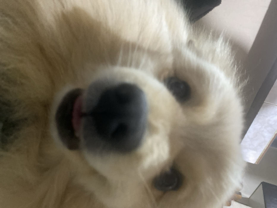 - "A close-up, head-on view depicts a small, light-colored dog, likely a Pomeranian or similar fluffy breed, filling the majority of the frame" by FM-WajJs2, licensed under CC BY 4.0