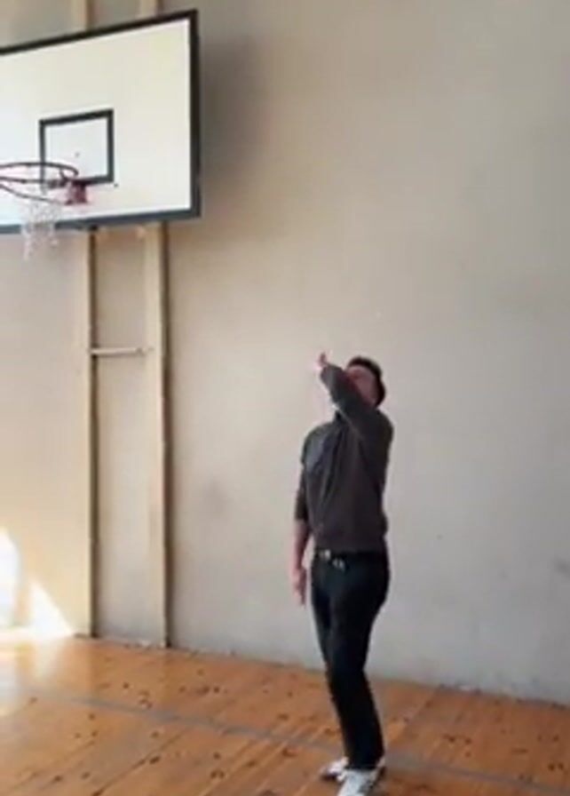 In a well-lit gymnasium, a man in a dark grey shirt and black pants is practicing volleyball. He stands in front of a basketball hoop and net, tossing a volleyball into the air and spiking it over a volleyball net. The gym has a hardwood floor and a light beige wall on one side, with windows on the other. Several individuals are seated on a bench near the net, observing the man's volleyball practice. Overhead, fluorescent lights illuminate the space.