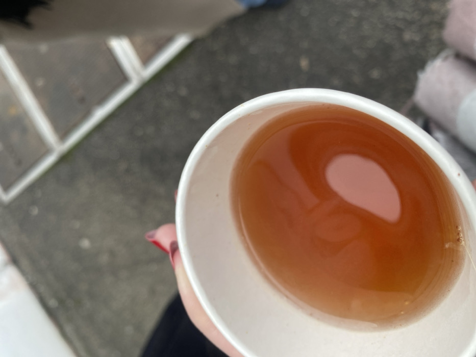 A white disposable cup, containing an amber-colored, translucent liquid with surface reflections and small bubbles, is held in a hand. The visible fingernails of the hand are painted dark red. The background is out of focus, revealing dark gray pavement with lighter linear markings. Blurred forms, including light beige and a subtle blue element, are discernible in the background. This scene is located in Schiltigheim, France.
