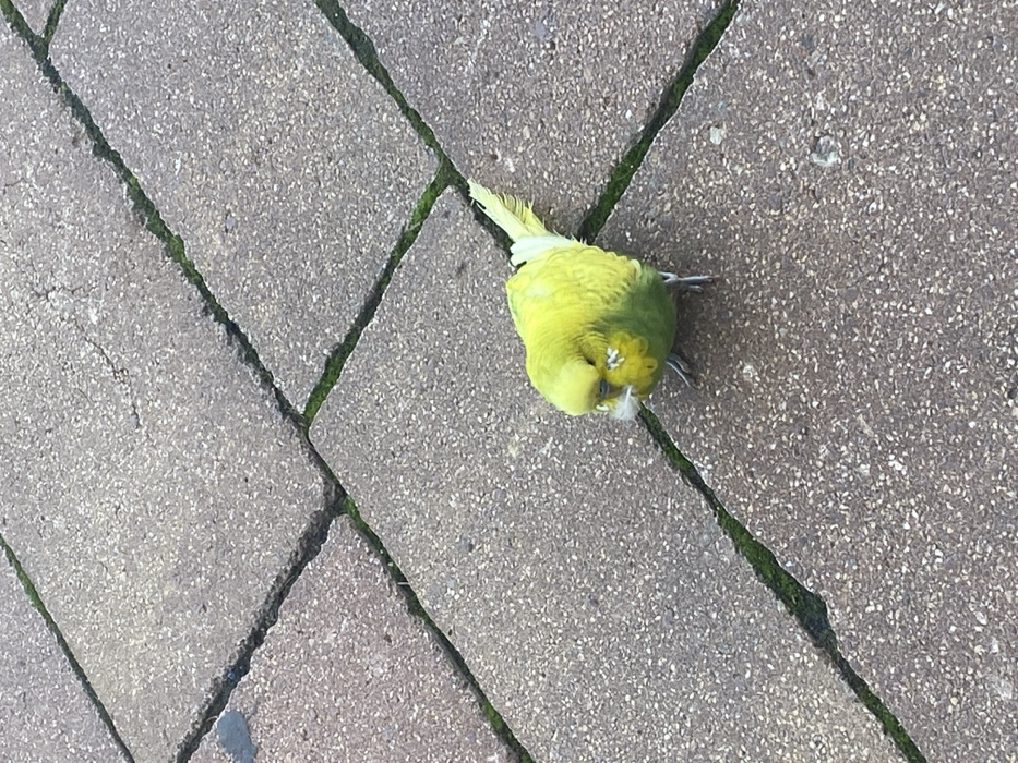 - "A single budgerigar, primarily lime-green with yellow accents and white patches on its head, stands on a paved surface in Tel Aviv, Israel" by FM-jWoq23, licensed under CC BY 4.0