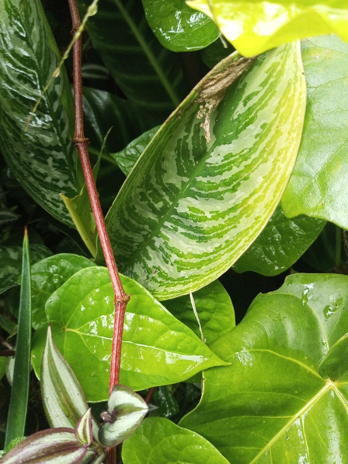 A close-up captures a vibrant cluster of wet, green foliage. A central, ovate leaf displays a unique pattern of wavy, muted green stripes. A reddish-brown stem with occasional nodules weaves through the leaves. To the left, a striped plant with purple and silver hues contrasts with the predominantly green backdrop. The leaves exhibit a glossy sheen, indicative of recent rain.