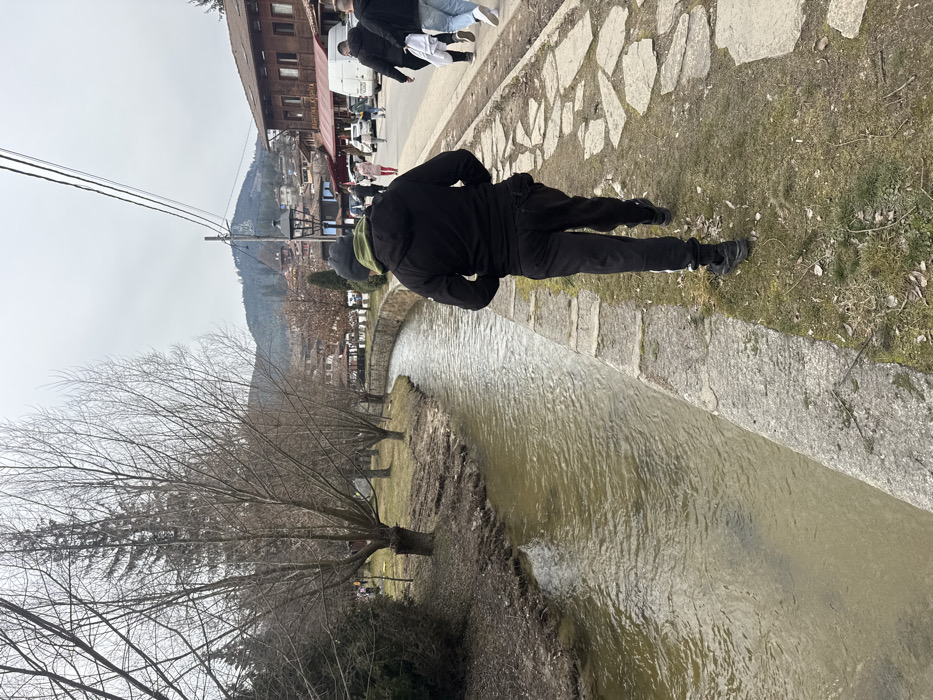 The image depicts an outdoor scene in Koprivshtitsa, Bulgaria, on an overcast day during what appears to be late winter or early spring. The perspective is from behind a pedestrian walking on a stone and grass path running parallel to a narrow, brownish-green river or stream. The foreground is dominated by a male individual seen from behind, wearing a black hooded jacket with a visible green interior hood, black athletic pants, and black shoes. He is walking away from the camera, slightly right of center, on a path composed of irregularly shaped stone slabs interspersed with grass and scattered dry leaves. To the left of this path, the river flows from the background towards the foreground, its bank partially reinforced with stone. Beyond the river's left bank is a grassy area with numerous bare deciduous trees, some with exposed roots, and a few evergreen trees. The ground in this area appears muddy and sparsely vegetated. In the mid-ground, across the river, a paved road is visible with several other pedestrians and at least one white van. To the right of the road, traditional Bulgarian-style buildings with wooden facades and dark roofs line the street. One building prominently displays signage in Cyrillic. A dark, ornate street lamp and overhead utility lines are also visible along the road. The background features a range of forested mountains or hills under a uniform grey, overcast sky. No direct sunlight is visible.