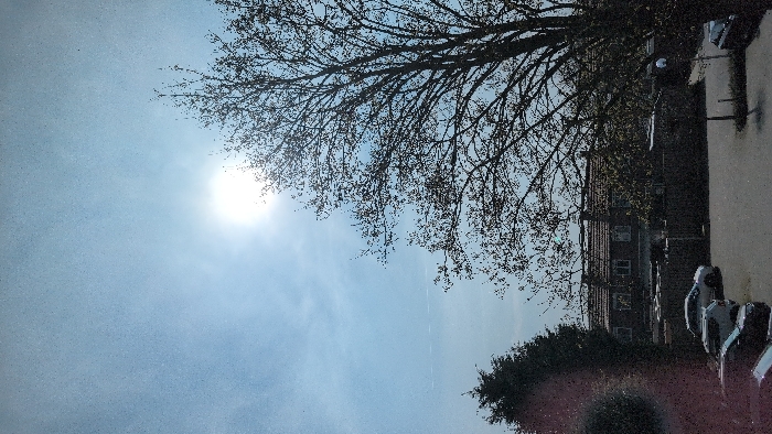 The scene depicts an outdoor, elevated perspective of a residential area in Venray, Netherlands, under bright, sunny conditions. The sky is light blue with atmospheric haze, dominated by a highly luminous sun in the upper-center right, producing significant glare. A faint, dashed white line, consistent with an aircraft contrail, traverses the upper-left sky quadrant. In the mid-ground, a paved, grey surface, appearing to be a parking area or street, occupies the lower portion of the frame. Three passenger vehicles are visible: a silver SUV or hatchback is parked facing left in the mid-left, a dark-colored car is partially visible in the bottom-left corner facing right, and another dark-colored car is partially visible in the bottom-right facing left. A dark, low-height fence runs horizontally across the mid-ground, separating the paved area from the background structures. A slender, dark pole, consistent with a streetlight or utility pole, stands upright on the right side of the paved area. Vegetation includes a large deciduous tree with sparse foliage, indicating an early stage of leafing, which occupies the right half of the image, its branches extending upwards and to the left. A dense, dark coniferous tree is partially visible on the far-left mid-ground. Additional smaller green trees and shrubs are situated between the fence and the background buildings. The background consists of a row of multiple attached residential houses, characterized by dark, possibly red, tiled roofs and rectangular windows across their facades. No individuals, specific actions, or interactions are discernible. A reddish, circular lens flare or artifact is present in the lower-left quadrant, partially obscuring the coniferous tree. The overall image displays a grainy texture.