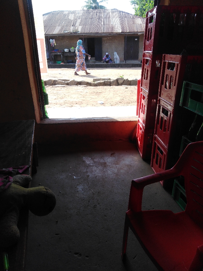 The image captures a view from inside a dimly lit room, looking out through an open doorway into a sunlit outdoor environment in Yelwa, Nigeria