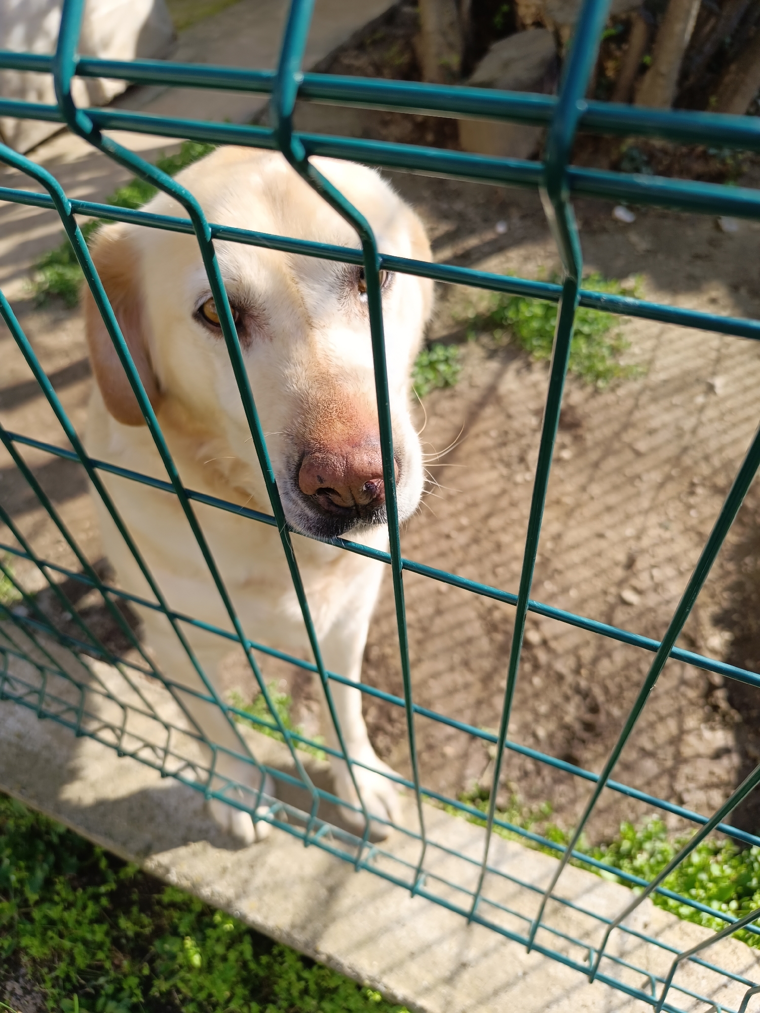 A light yellow Labrador Retriever stands behind a green wire fence. The dog's head and front paws are visible. The background shows bare earth with patches of green vegetation. The scene is sunlit. This image does not contain location information, the location mentioned in the prompt is likely incorrect.