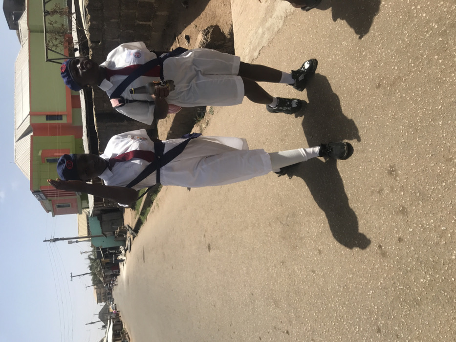 The image depicts two young females in uniform walking on a paved road in Jos, Nigeria, under clear, bright daylight