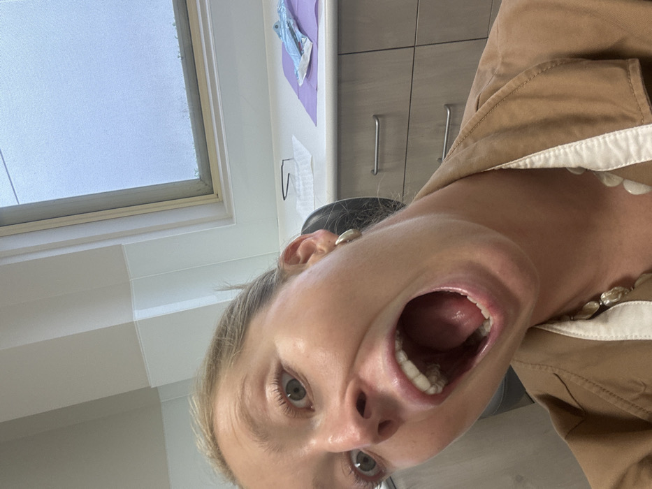 A woman is angled in the frame, facing downward. Her mouth is open wide. Behind her are bathroom cabinets with silver handles. A small, frosted window is visible above and to the left, showing an obscured view of the outside. The woman wears a tan shirt with white trim, and a pearl necklace. A hook hangs on the wall next to the cabinets.