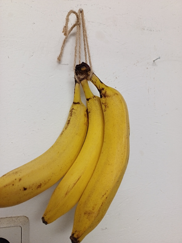 - "Three ripe bananas, predominantly yellow with scattered brown senescence spots, are suspended against a textured, white-painted wall in an interior setting in Leipzig, Germany" by FM-rFWs12, licensed under CC BY 4.0