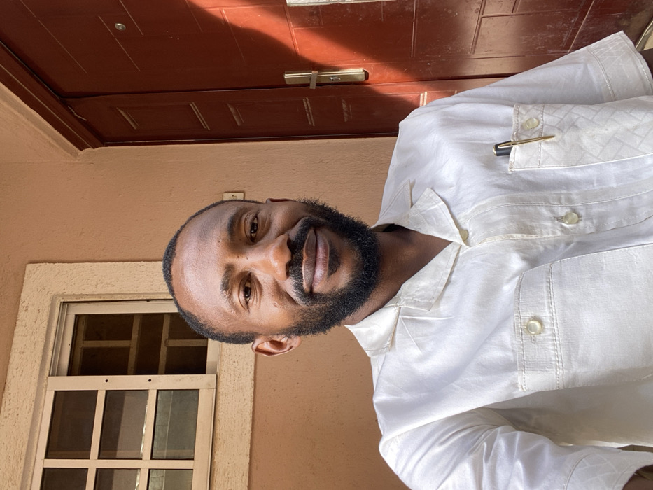An adult male with a medium complexion, short dark hair, and a full beard is depicted in a headshot-style image, smiling and looking directly at the camera. He is wearing a light-colored, short-sleeved collared shirt that features two breast pockets; a gold-colored pen with a black cap is visible in the left breast pocket. The individual is positioned outdoors or in a doorway against a light brown stucco or painted masonry wall. To the subject's left, a white-framed window with internal security grilles is visible. To the subject's right, a reddish-brown door with a gold-colored handle and lock mechanism is partially visible. Direct sunlight illuminates the scene, casting a diagonal shadow across the upper right section of the door. The scene is located in Sabon Tasha, Nigeria.