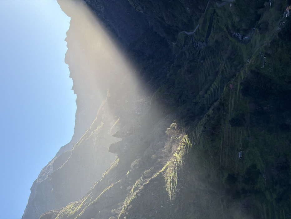 The scene depicts a deeply incised, mountainous valley located in Ribeira Brava, Portugal. The sky above is clear and light blue. A distinct, diagonal shaft of sunlight, diffused by atmospheric haze, illuminates the upper-left section of the valley, extending from the upper-right corner of the frame and casting a sharp shadow line across the valley's central and right portions. The valley's steep slopes are covered in green vegetation, featuring numerous agricultural terraces constructed into the terrain on both sides. A narrow river or stream flows along the valley floor, accompanied by a winding, unpaved road or track visible on the right bank. Several small, single-story structures, consistent with dwellings or agricultural buildings, are scattered on the terraced slopes; one with a reddish roof is present on the lower-right slope, and another with a light-colored roof is on the lower-left. Two prominent, jagged rock formations are discernible on the mid-left slope, partially illuminated by the direct sunlight. No individuals or specific actions are observed within the frame.