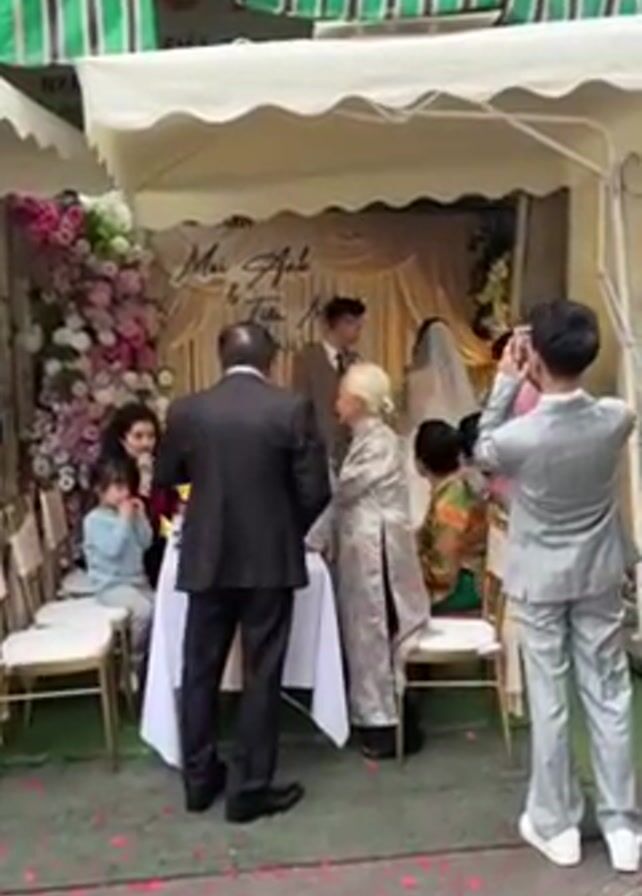 wedding ceremony taking place outdoors under a white tent structure. The wedding backdrop is decorated with pink and white flowers and the names "Mai Anh & Tien." In front of the backdrop, a table is set up, and the bride and groom are visible. Around the table, several people are gathered, including an elderly woman in traditional clothing, a man in a black suit, and a child sitting on a chair. Another man in a grey suit is taking photos with his phone. The ground is covered with red flower petals. The video also shows a glimpse of the surrounding environment, with storefronts and awnings visible in the background.