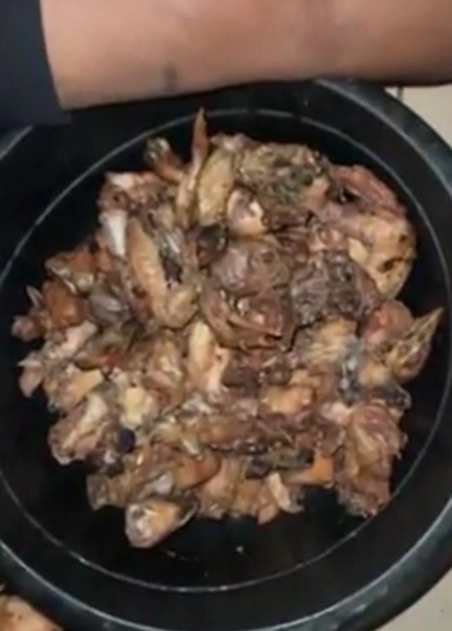 close-up of a large black plastic tub filled with what appears to be fried or roasted chicken pieces