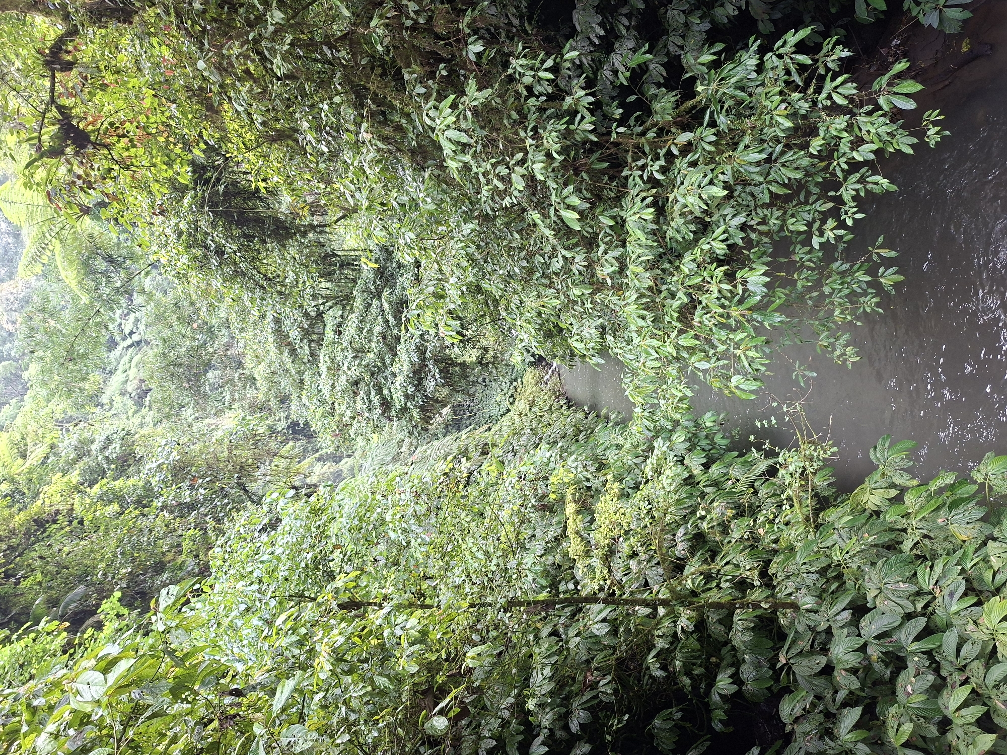 The photograph captures a dense, green, tropical forest scene in Petang, Indonesia. A river runs through the scene on the right, its dark water contrasting with the vibrant greenery. The vegetation is lush, with various species of plants, including trees, shrubs, and smaller plants, creating a dense and layered effect. The lighting is soft and diffused, suggesting an overcast day or a location deep within the forest where sunlight is filtered through the canopy. No people or animals are visible in the image. The composition of the shot emphasizes the natural beauty and biodiversity of the area.