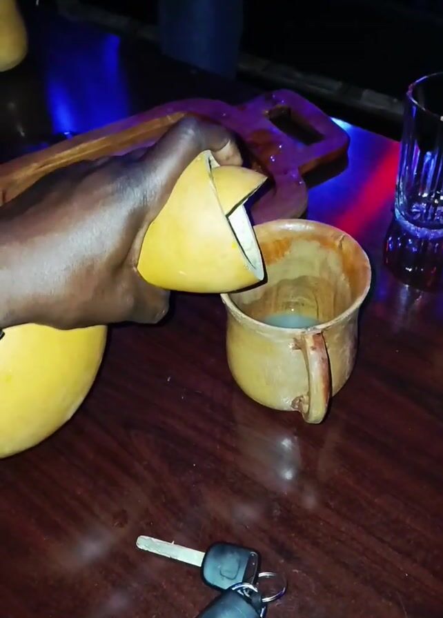 A close-up shot shows a dark-skinned hand pouring a milky liquid from a yellow, gourd-like container into a rustic, earthenware cup